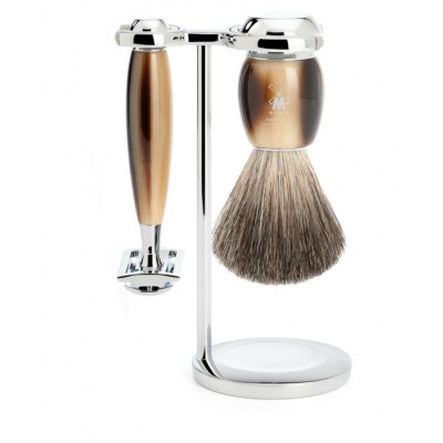 Безопасная бритва и подставка, где будет невероятно удобно хранить свои бритвенные принадлежности должны быть у каждого мужчины, полюбившего бритье такими инструментами. Даже с эстетической стороны это смотрится красиво, дорого и роскошно. Особенно набор от известнейшего бренда MUEHLE, который вошёл в великолепную коллекцию под названием VIVO. Производители этой марки всегда используют только высококачественные материалы как натуральные, так и синтетические, подвергая их специальной обработке с целью улучшения их качеств. В данном наборе используется особая смола, по цвету идентична с рогом. Второй материал, который использовали, это сталь с хромированной обработкой. То есть твердая сталь теперь стала еще более прочной и долговечной. Вместе со светлой смолой, сталь смотрится просто непревзойденно. Кисть помазка исполнена из мягкого и нежного ворса барсука, который позволяет максимально легко и гладко распределить по лицу и шее средство для бритья.