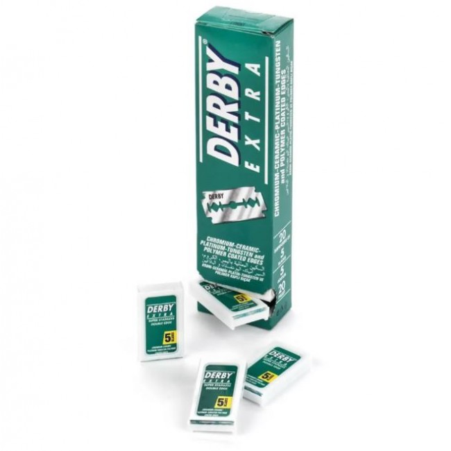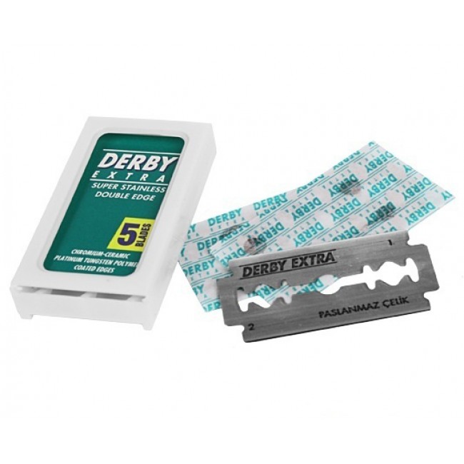 Сменные лезвия Derby Extra признаны одними из лучших в мире по соотношению цена/качество и заслуженно пользуются популярностью у ценителей классического бритья. Производятся в Турции из шведской платинированной нержавеющей стали. Имеют пятислойное покрытие из хрома, керамики, платины, вольфрама, полимера, что обеспечивает максимально долгое и комфортное бритьё. Острота лезвия – мягкая/средняя.