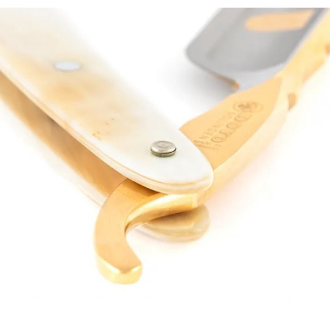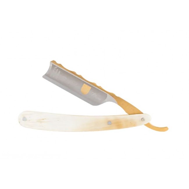 Эта бритва изготовлена из углеродистой стали с обозначением материала 1.2210, более известной как серебристая сталь. Чтобы достичь жесткости около 61 HRC, материал нагревается до температуры свыше 1000 градусов, а затем немедленно закаляется специальным маслом. Дальнейшая закалка при температуре около 200 градусов придает лезвию эластичность и прочность. Украшена 24-каратным золотом.