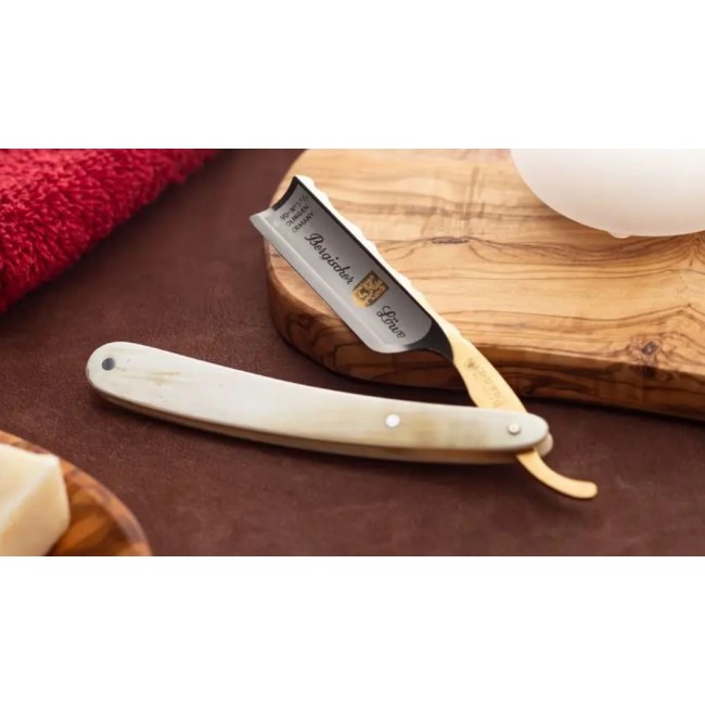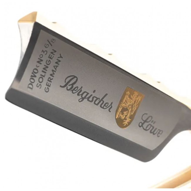 Бритва DOVO Золинген 6/8 дюймов носит название «Bergischer Löwe» и имеет испанскую голову, тонко обработанное лезвие, украшенное золотом. Как дань родному краю и его истории, лев как геральдическое животное украшает каждую из бритв ручной работы. Эргономично устроено место для большого пальца для оптимального управления бритвой.