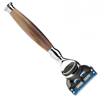 В данной модели ручка изготовлена из рога буйвола, в верхней и нижней части в сочетании с хромированными латунными фитингами. Рог буйвола использовался для создания полезных и декоративных предметов с древнейших времен. Этот натуральный материал отбирается и обрабатывается очень тщательно: только твердые рога используются для изготовления ручек бритвы. Прошедшие предварительный отбор, они обрабатываются на токарном станке и, наконец, полируются до глянцевого блеска. Цвет у каждой заготовки разный, переливается от белого до коричневого и темно-коричневого, придавая каждому продукту свой собственный индивидуальный характер.