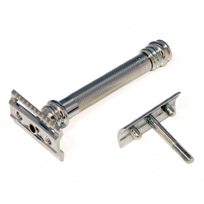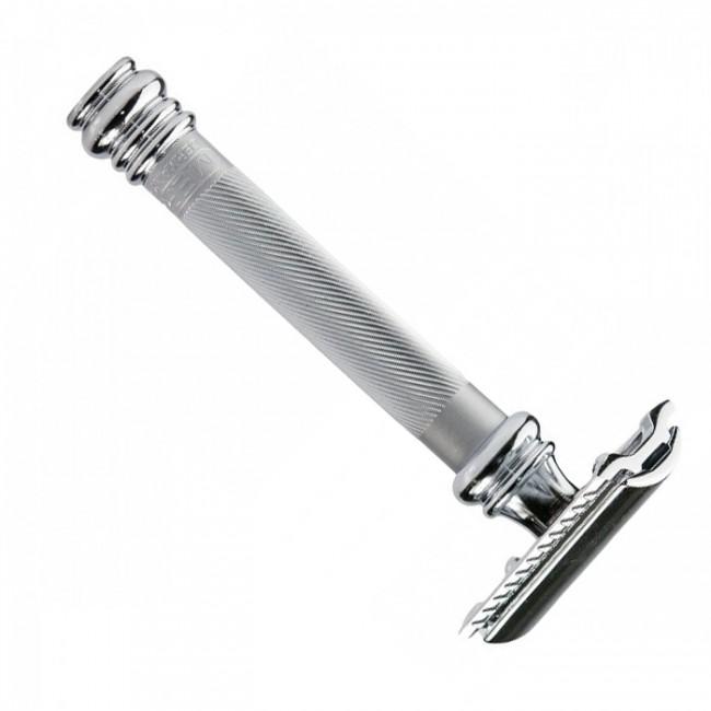 Станок для бритья Т-образный 90 38001 MERKUR SAFETY RAZOR WITH EXTRA LONG HANDLE - это особая модель опасной бритвы с удлиненной рукояткой, которая заметно удобнее других вариантов процессе бритья. Изделие сделано из немецкой стали и покрыто хромом. Дополнительный слой не только повышает надежность, а еще и помог достичь безупречного внешнего вида. Также будущему владельцу понравится относительно небольшой вес, всего 120 г. За счет диагональной резьбе на стальной рукоятке станок не выскользнет из руки, что исключает ранение в процессе бритья. С этой же целью производитель сделал рукоятку длинной 103 мм. Соответственно, в руке модель сидит прекрасно и про неудобства в процессе использования можно забыть.