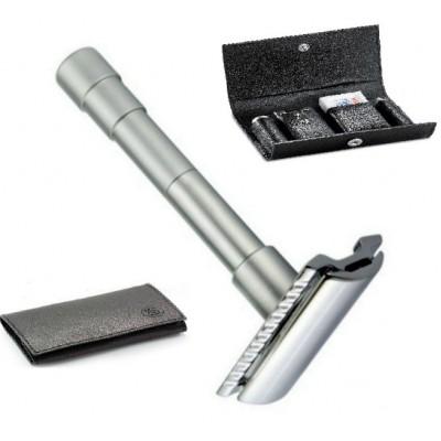 Модель 46 - это небольшая легкая безопасная бритва, которая легко разбирается для быстрой транспортировки или хранения. Просто положите его в элегантный кожаный чехол чтобы взять с собой. Здесь вы также найдете пачку лезвий для вашего путешествия!