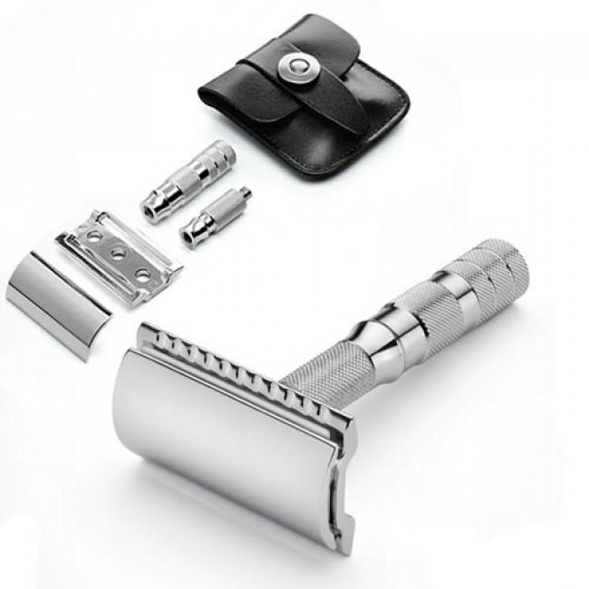 Станок для бритья Т-образный 90 933000 MERKUR TRAVEL RAZOR - это небольшая модель т образной бритвы для поклонников компактных изделий. Преимущественно использовать такой вариант стоит тем, кто часто путешествует. Бритва легко раскладывается после чего ее можно сложить в небольшой чехол из искусственной кожи на кнопке. В разложенном виде изделие поместится даже в карманах верхней одежды. Масса модели всего 58 г, так что вы без проблем сможете брать ее с собой в дорогу. Чтобы сменить лезвие вам достаточно будет только открутить головку и вставить в нее новое. Прослужит такой станок очень долго, а все благодаря нержавеющей стали, которую использовали в процессе создания.