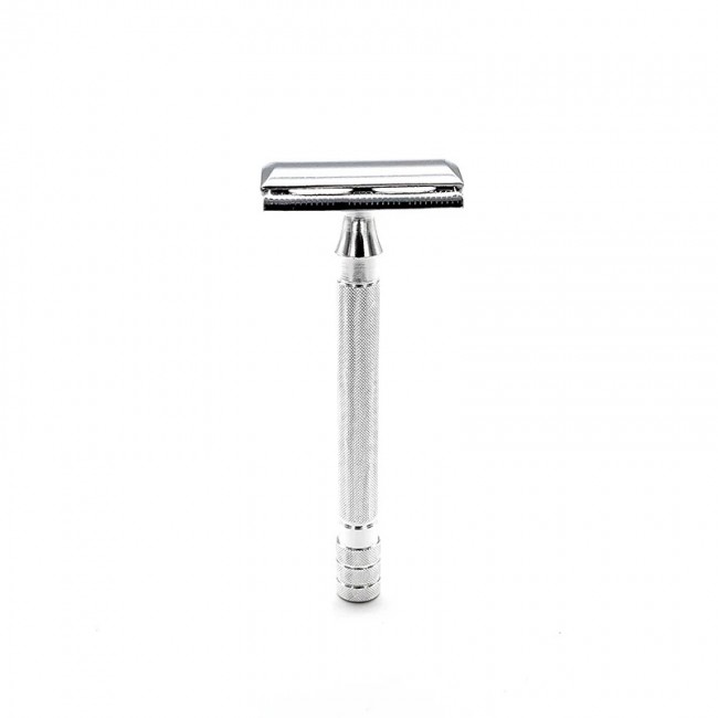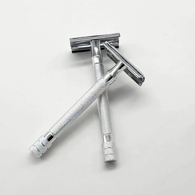 Металлическая ручка станка имеет текстурированную и зазубренную поверхность, что не только придает бритве элегантный внешний вид, но и обеспечивает высокий уровень удобства в процессе бритья, поскольку станок не соскальзывает и уверенно лежит в руке.