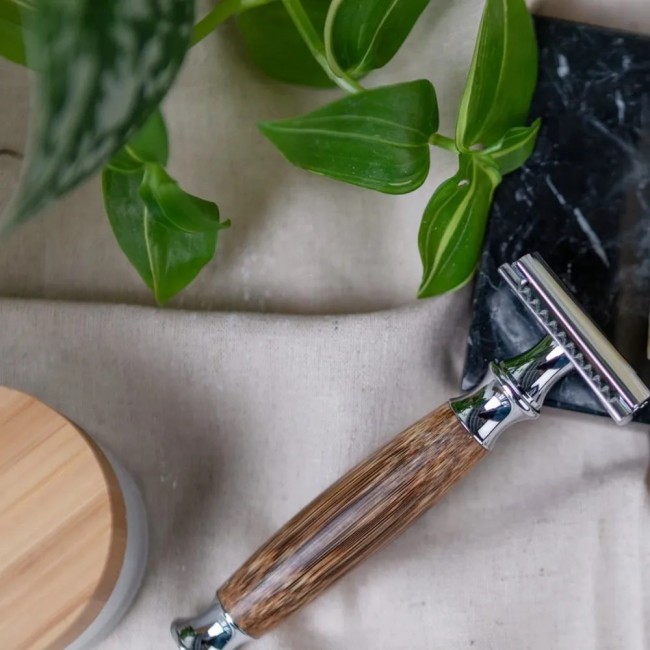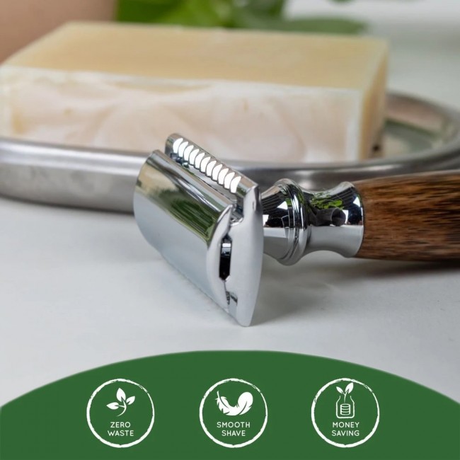 Материал ручки бритвы - нержавеющая сталь и бамбук. Бамбук уже несколько веков успешно используется при производстве самых разнообразных изделий. Ведь его красивая текстура поражает с первых минут - приятная и теплая на ощупь. Материал очень прочный и долговечный. В сочетании с хромированным покрытием еще и обеспечивает хорошее сцепление с рукой.