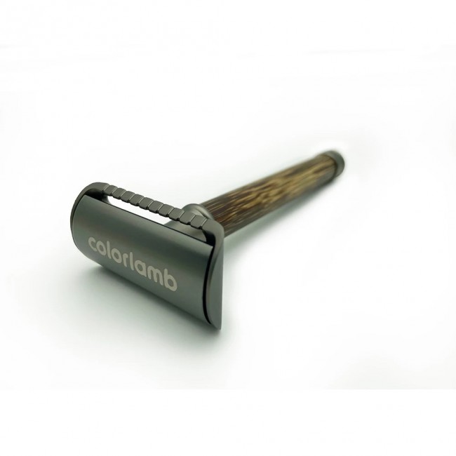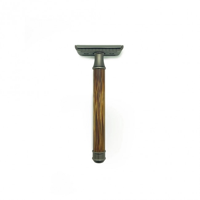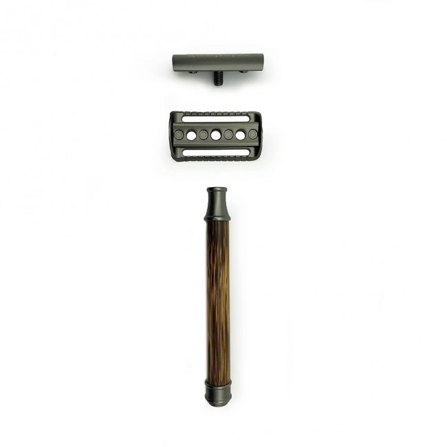 Основная часть ручки изготовлена из бамбука – фактурной волнистой древесины с интересной текстурой. Материал обработан по особой технологии маслом, поэтому надежно защищен от износа и воздействия воды и косметических средств. Торцы рукоятки имеют матовые металлические вставки графитового цвета, за счет чего станок приобретает поистине элегантный стиль.