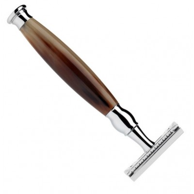 В данной модели ручка изготовлена из рога буйвола, в верхней и нижней части в сочетании с хромированными латунными фитингами. Рог буйвола использовался для создания полезных и декоративных предметов с древнейших времен. Этот натуральный материал отбирается и обрабатывается очень тщательно: только твердые рога используются для изготовления ручек бритвы. Прошедшие предварительный отбор, они обрабатываются на токарном станке и, наконец, полируются до глянцевого блеска. Цвет у каждой заготовки разный, переливается от белого до коричневого и темно-коричневого, придавая каждому продукту свой собственный индивидуальный характер.