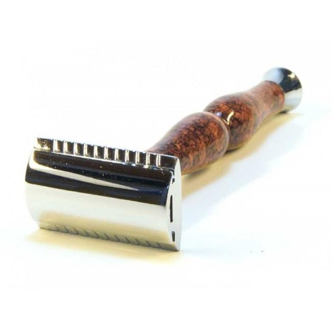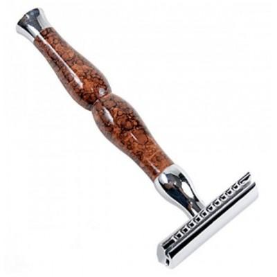 Это модель немного тяжелее своих предшественников, вес составляет 110 грамм. Рукоять выполнена в виде коричневого мрамора, очень увесистая, отлично лежит в ладони, длина 111 мм, прекрасно балансирует. Это так же выделяет эту модель из остальных бритв в данном классе. Материал для изготовления выбран сплав латуни, который покрыт никелем. Довольно агрессивная и в тоже время приятно бриться данной бритвой.