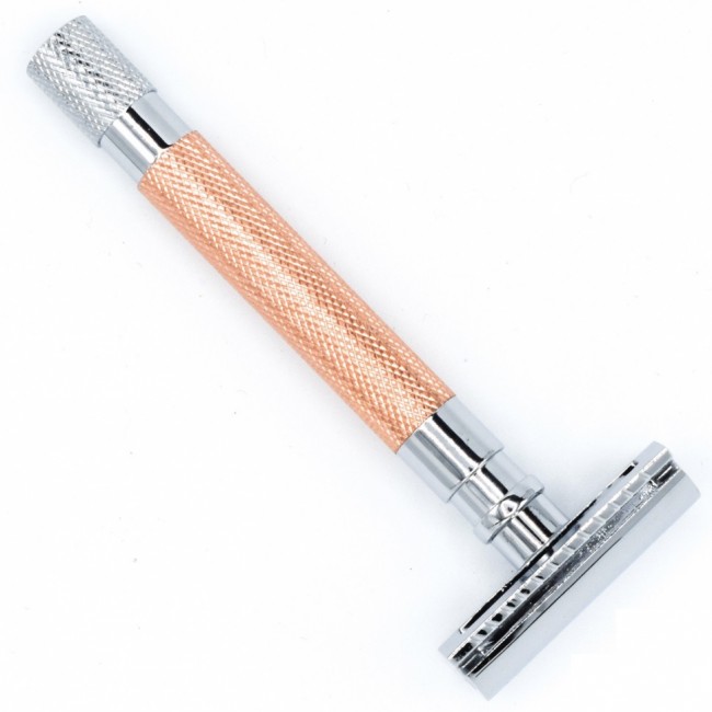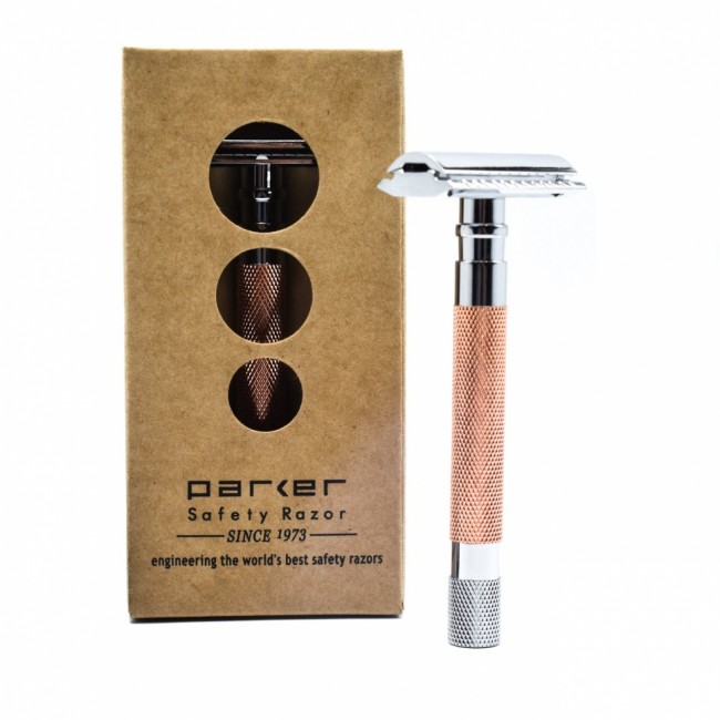 Бритва Parker 56R Rose Gold - новая модель, представленная в конце 2020 года. Это классический станок, состоящий из трёх частей. Изготовлен c красивым покрытием из розового золота и хромированной отделкой для чистого и комфортного бритья. У него агрессивная фактурная ручка, хороший вес и прекрасный баланс. Голова с закрытым гребнем идеально подойдёт для начинающих или тем, кто предпочитает мягкое бритье. Верхняя пластина откручивается пальцами, что позволяет легко заменять лезвие по мере необходимости. Бритва поставляется в коричневой картонной коробке.