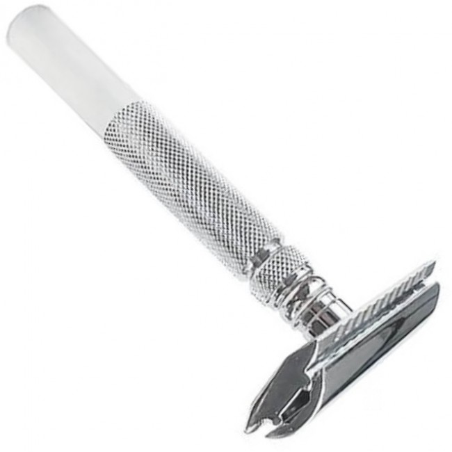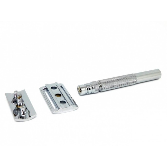 Это классический станок, состоящий из трёх частей. Текстурированная ручка имеет гальваническое покрытие, что делает ее потрясающей для использования мокрыми и мыльными руками. Бритва оснащена современной головой закрытого типа, которая была разработана для минимизации порезов благодаря точному углу лезвия и экспозиции. Это отличный выбор как для начинающих, так и опытных пользователей безопасной бритвы.