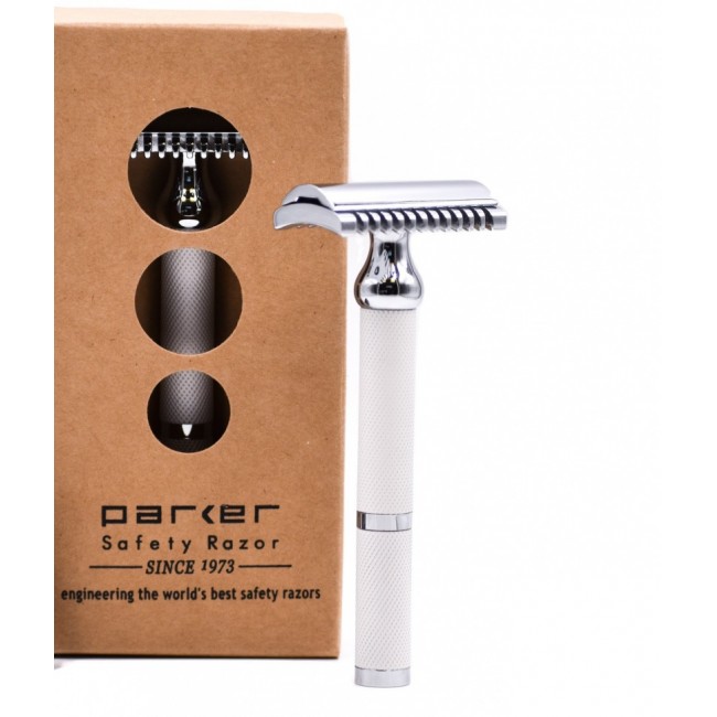 Бритва изготовлена из сплава латуни и покрыта никелевым напылением. Рукоять с текстурированным покрытием белого цвета, для более удобного сцепления с ладонью, даже в мокрых руках. Для смены лезвия откручивается верхняя часть гребешка.