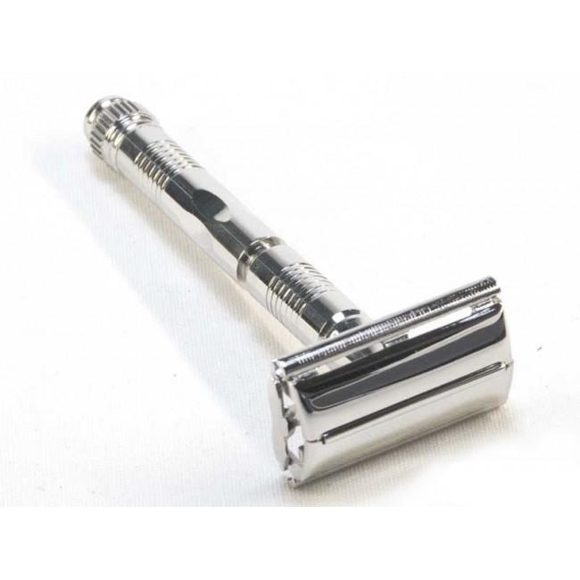 Удобная бритва, цельнометаллическая, с довольно длинной рукояткой. Изготовлена с полностью никелированной поверхностью, что придает данной бритве блестящий вид и прочность. Для смены лезвия нужно сделать пару вращений нижней части рукояти, чтобы открыть раскрывающийся механизм головки, старое лезвие автоматически поднимется из пазов, что дает возможность заменить его на новое. На рукояти присутствуют углубления для пальцев и текстурированные окружности, расположенные в верхней и нижней части, для более удобного захвата.
