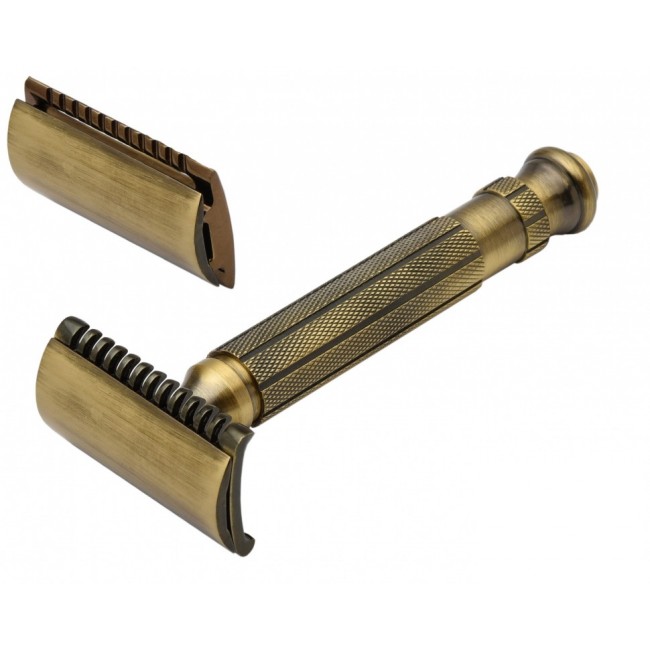 Станок для бритья Т-образный Pearl L-55 Antique Brass Closed comb & Open Comb (с закрытым гребнем и открытым гребнем) – это массивная безопасная бритва из трёх частей, весом 95 грамм.