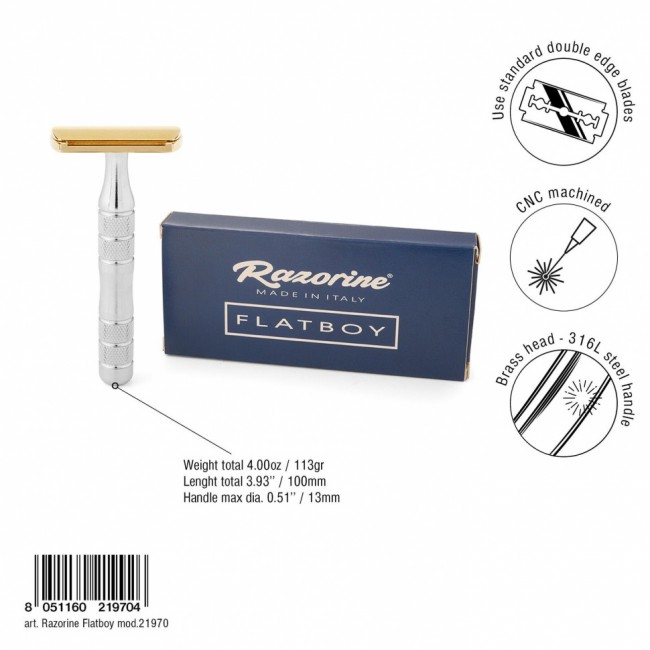 Razorine FLATBOY — это ваша безопасная бритва, которой суждено служить всю жизнь и передаваться от отца к сыну. Как и вся продукция Razorine, серия FLATBOY производится полностью в Италии с использованием лучших итальянских материалов.