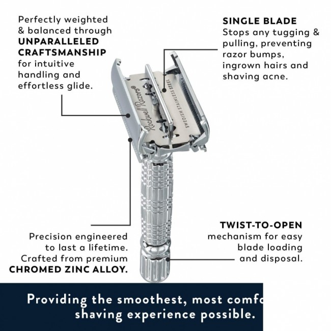 Самое удивительное, что за такую цену вы получаете бритву, полностью выполненную из цинкового сплава и покрытую хромом. Долговечность и стойкость к ржавчине заставит ревновать даже вашего дедушку. Станок не просто так имеет маркировку R1: она означает самую мягкую настройку в системе «Роквелл» и идентична плите №1 топовой модели компании – Rockwell Razors 6C. С таким уровнем агрессивности бритва не позволит вам порезаться даже в самых чувствительных областях; она защитит вас от раздражения и вросших волос.