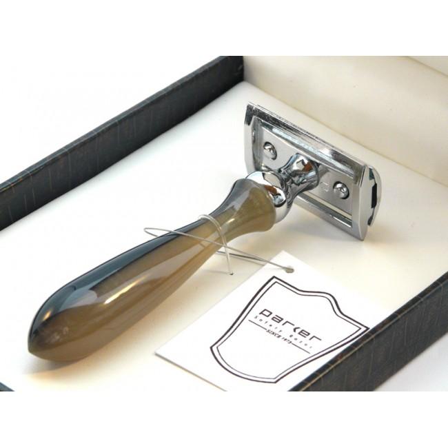 Перед Вами легендарный вариант бритв - Т-образная бритва известного бренда Parker, модель 11R. Несомненно, Вам бросится в глаза солидный и сдержанный внешний вид. Светлая и искрящаяся головка бритвы контрастирует с тёмной рукояткой, изготовленной из самого что ни есть настоящего рога. Она отполирована до идеальной гладкости и покрыта качественным лаком, что делает ее более гладкой и красивой. А при сложении всех этих преимуществ, Вы получите идеальный привлекательный вариант повседневной бритвы, который смешивает в себе приклекательность, комфорт, красоту, высокое качество и безупречный результат.