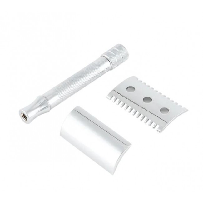 Головка безопасной бритвы изготовлена с использованием процесса литья цинка, поскольку он создает инструменты с максимальной точностью даже сложных форм. Чтобы обеспечить удобное распределение веса, завод использует только латунь для ручки. Хромированная отделка защищает бритву от коррозии и подчеркивает качественный дизайн.
