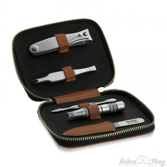 Маникюрный набор Dovo 407066 в кожаном чехле ручной работы вмещает в себя все необходимые инструменты. Маникюрный набор, состоит из пяти предметов, создан специально для представителей сильного пола. Инструменты позволят джентльменам с легкостью следить за своей внешностью. Благодаря небольшому размеру данный аксессуар будет удобен в дороге или путешествии.