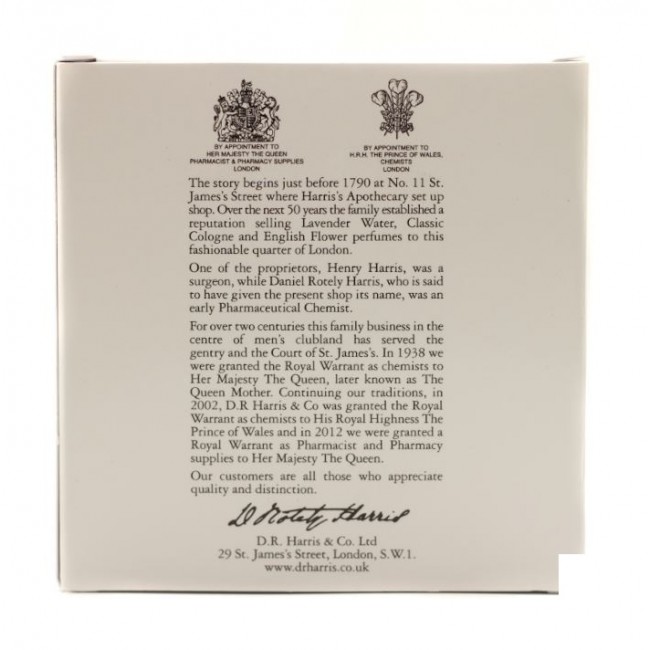 Одно из старейших предприятий Англии, D R Harris ведет свою историю с 1790 года, когда аптекарь Харрис открыл на престижной улице Сент-Джеймс в Лондоне свой первый магазин. На протяжении более двух столетий этот семейный бизнес успешно развивался, приобретая много поклонников. Безупречная репутация и качество продукции подтверждается высоким статусом поставщика Королевского Двора Англии. На сегодняшний день продукция D R Harris всё так же производится традиционными способами по старинным рецептам, отличается классическими ароматами и выверенными ингредиентами.