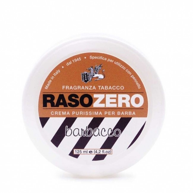 Rasozero Barbacco представляет сочетание 2 продуктов: крема и мыла. Его консистенция похожа на твёрдый и сухой крем, а по текстуре он напоминает размякшее мыло. Можно применять непосредственно на кожу лица или вспенивать с помощью помазка. Чтобы добиться больше объёмной и густой пены, можно воспользоваться специальной чашей для взбивания. Контейнер, в котором выпускается крем-мыло, также предназначен для создания пены, но результат будет немного хуже. Ароматная композиция базируется на табачных и сандаловых нотам, а также на запахе березовой смолы. Присутствующие оттенки жасмина и иланг-иланга. Можно услышать акценты кедра и лимона.