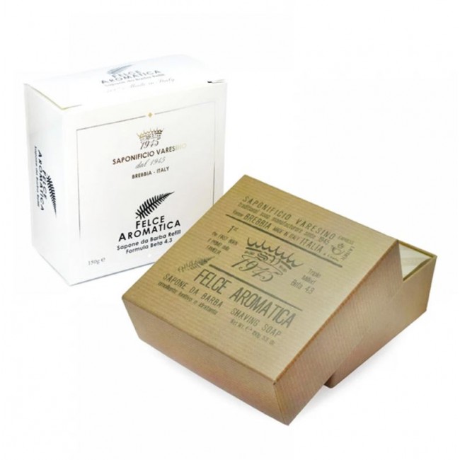 Felce Aromatica реализуется в качестве запасного куска мыла. Формула мыла дает насыщенную пену, которая эффективно смягчает волосы, а также дополнительно поддерживает влагу в коже и способствует более плавному скольжению лезвия, что положительно сказывается на гладкости бритья.
