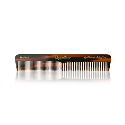 Расческа Dapper Dan Hand Made Styling Comb изготовлена в ручную из высококачественного ацетата и отшлифована до совершенства. Она гладко скользит по волосам и не царапает кожу. Имеет два ряда зубьев разной ширины. Благородный темный цвет в сочетании с золотистыми надписями выглядят дорого и изыскано, поэтому она может стать хорошим подарком в дополнении с укладочным средством Dapper Dan.