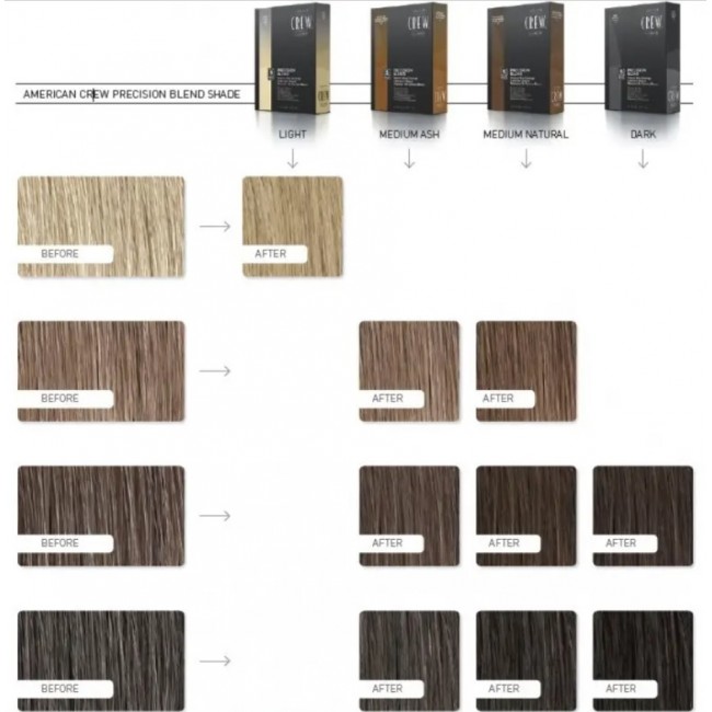 В общем, система маскировки от American Crew Precision Blend включает 4 базовые оттенки с разной степенью покрытия (25%, 50%, 75% или 100%), который вы выбираете в зависимости от имеющейся седины и естественного цвета волос.