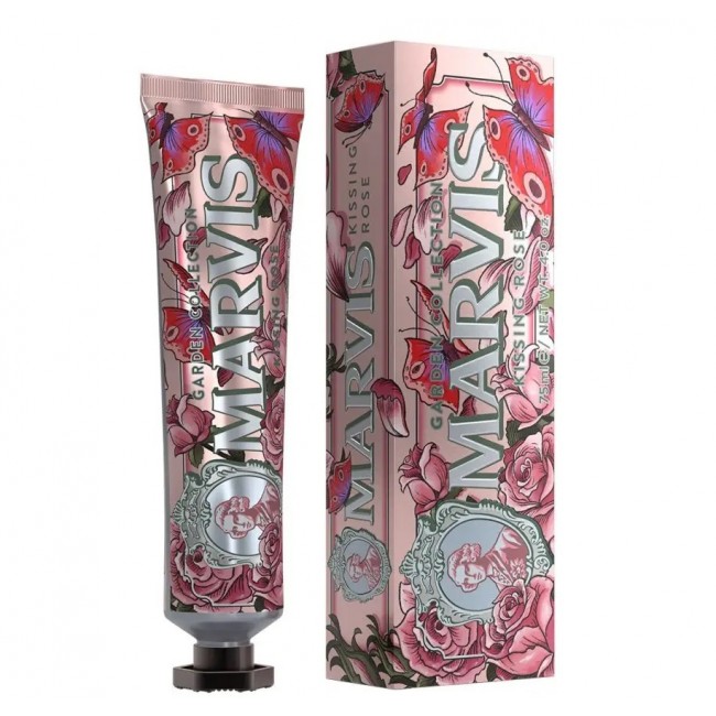 Marvis Garden Collection - лимитированная линейка известной итальянской марки зубных паст, которая славится своими уникальными вкусами и стильным дизайном упаковки. Зубная паста Marvis Kissing Rose искусно сочетает в себе романтическую атмосферу с выразительным вкусом, который наполнит вашу улыбку ароматными нотами болгарской розы и освежающей мятой. Изысканный вкус, вдохновленный миром тонких ароматов.