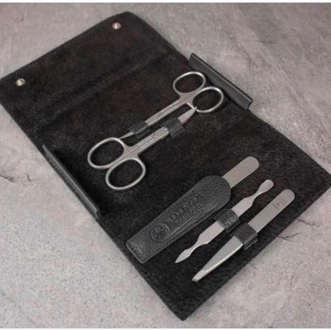 - Черный кожаный кейс с коричневым логотипом Dovo Solingen 15 х 8.5 х 2 см