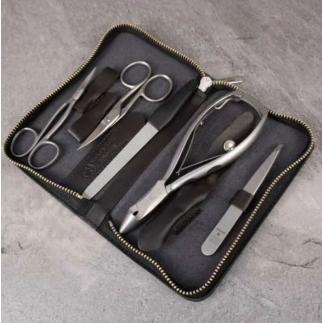 Набор для педикюра и маникюра Dovo Solingen изготовлен из высококачественной нержавеющей стали, сатинированный. Инструмент бережно упакован в мягкий кожаный футляр ручной работы. В наборе специальный инструмент для удобного ухода за грубыми ногтями.