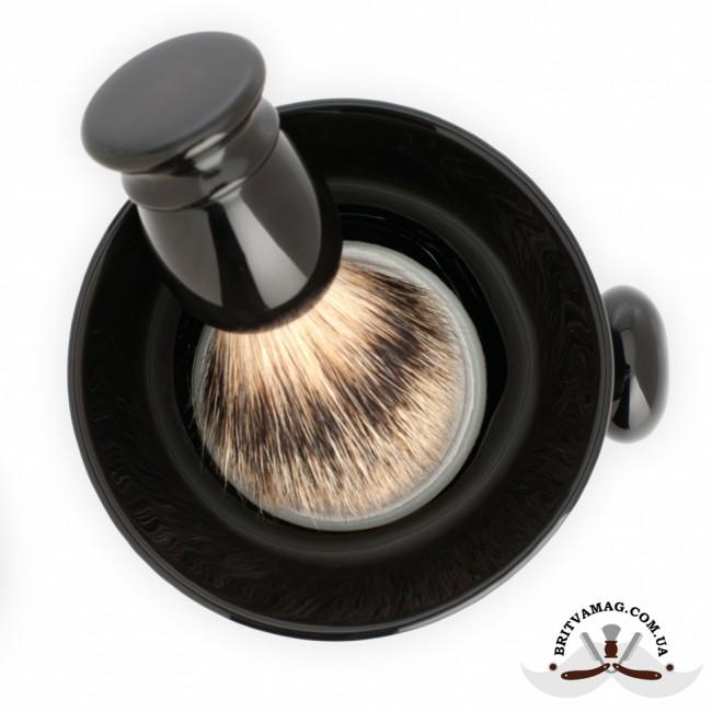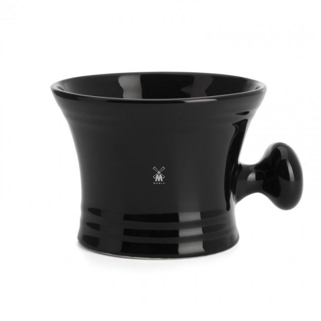Фарфоровая чаша для бритья MUEHLE RN 46 с ручкой для более удобного хвата мокрыми руками, чёрного цвета. Чашами похожей формы, в прошлом, на протяжении многих десятилетий пользовались в традиционных английских барбершопах. У чаши увеличенная высота краев, которая позволяет формировать большое количество пены без страха расплескать ее через края.