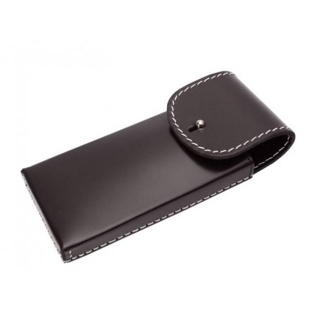 Классический футляр Dovo предназначен для хранения двух опасных бритв. Изготовлен из толстой черной натуральной кожи с белой строчкой и черной бархатной подкладкой. Застежка сделана из серебра.