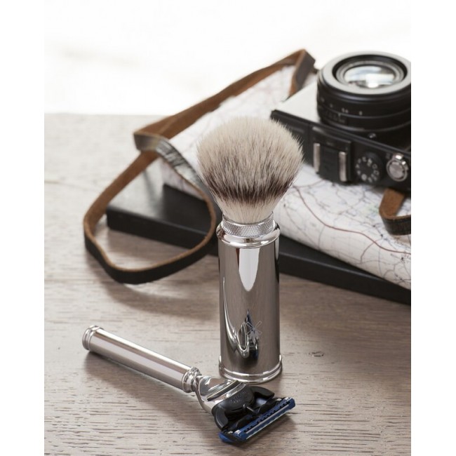 Помазок дорожный для бритья MUEHLE 31 M 20 TRAVEL в тубусе, с ворсом из фибры высшей категории Silvertip. Помазок помещается в тубус с помощью удобного поворотного механизма и закрывается колпачком из хромированного металла, что отлично защищает его в дороге. Кисть помазка в дорожной серии делается только из фибры Silvertip - самой быстросохнущей материал и очень износостойкой.