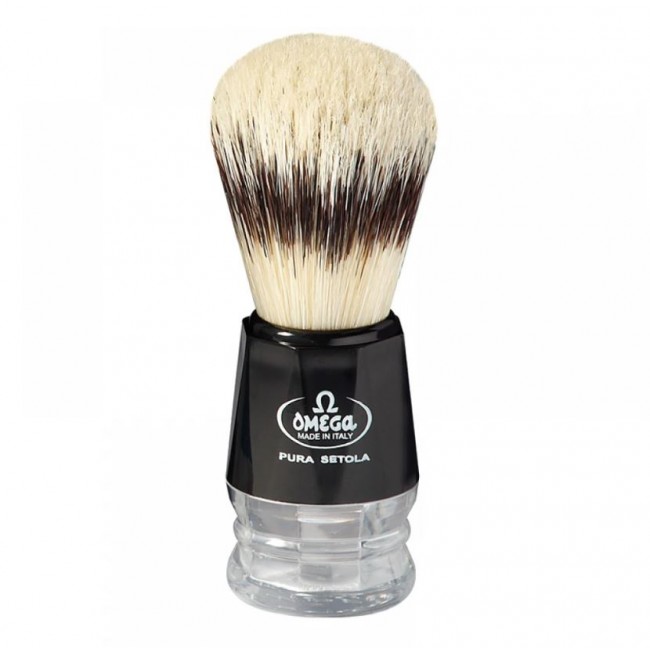 Стильный помазок с ручкой из черного и прозрачного пластика. Щетина из натурального ворса кабана. Высокое качество от итальянского бренда Omega.