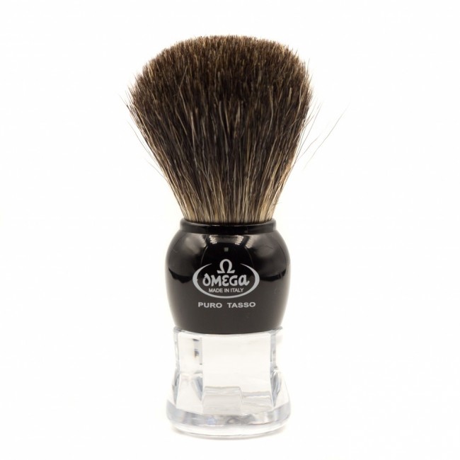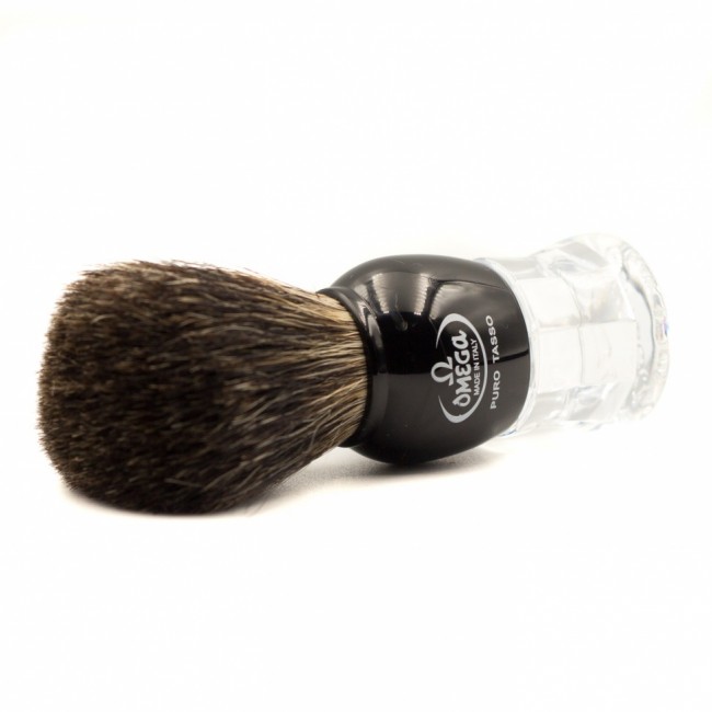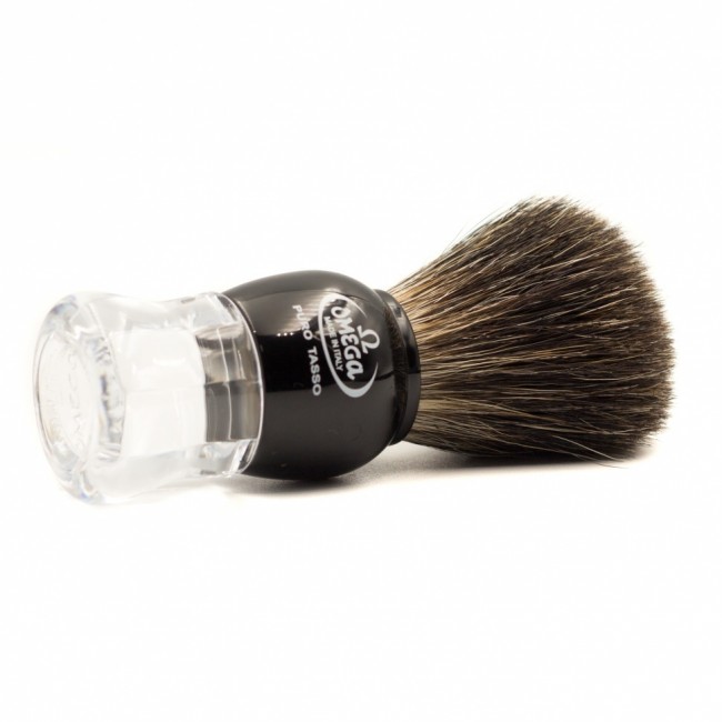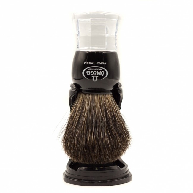 OMEGA 33167 помазок с ворсом из натурального барсука, поставляется на пластиковой подставке. Материал ручки - прозрачный акрил со струйной, чёрной отделкой. Тип ворса - натуральный барсук. Он узнаваем по относительно тёмному окрасу от остальных типов ворса. Кончик каждой натуральной ворсинки имеет фланец, который позволяет сохранять тепло и удерживать влагу, а также увлажнять и согревать кожу, таким образом подготавливая ее к процессу бритья.