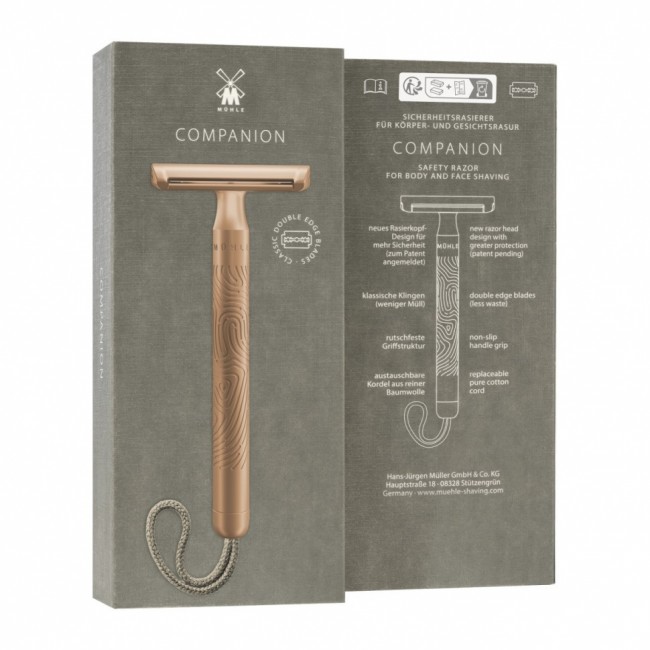 COMPANION - перша безпечна бритва, розроблена спеціально для задоволення потреб усіх користувачів у голінні. Деталі головки надають бритві дуже м'якого регулювання і значно знижують ризик порізів під час гоління тіла. Конструкція COMPANION з трохи довшою ручкою забезпечує зручність використання у всіх областях (ноги, інтимна зона, пахви і груди). На кінці ручки MÜHLE COMPANION є шнур із чистої бавовни, доступний у кольорах Корал, Бірюза, Синій, Пісок і Камінь. Це означає, що безпечну бритву можна зберігати в підвішеному стані та швидко підготувати до використання. Розроблено для людей, які шукають унісекс-продукт, який більше не матиме жодного значення, за винятком, звісно, тих випадків, коли йдеться про екологічність і нульові відходи. Чисті, довговічні матеріали в поєднанні з сучасним і непідвладним часу дизайном, який дбає про всіх: гоління ніколи не було таким гарним, як із цим новим компаньйоном.