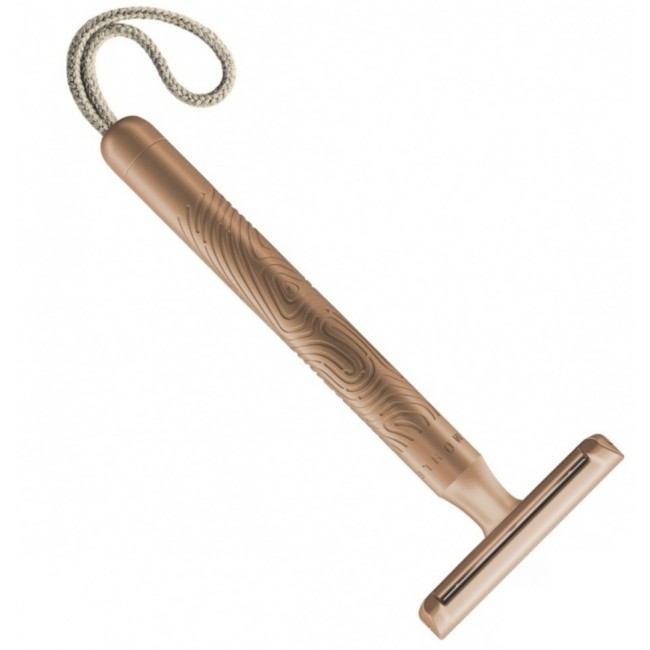 Матеріал бритви - метал із PVD-покриттям, матове рожеве золото. PVD - це абревіатура від "Фізичне осадження з парової фази". У цьому процесі твердий матеріал випаровується у вакуумі і наноситься на поверхню деталі, досягаючи дуже високої твердості. Точніше, іонні частинки з вихідного матеріалу замінюються на "різнокольорові". У результаті утворюється тонкий, склеєний поверхневий шар матового рожевого золота. Післясмак навряд чи може бути більш елегантним і довговічним.
