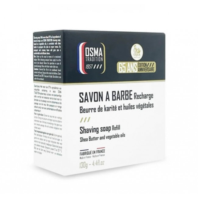 Мило для гоління французької компанії Laboratories Osma, зроблене на більш ніж 95% натуральних інгредієнтів. Містить кокосове і соняшникове масло, також збагачене маслом ши, яке живить шкіру і забезпечує плавне ковзання бритви. Захищає шкіру від дії ультрафіолетових променів, бактерій і запалень. Ідеально підходить для комфортного, м'якого гоління, має легкий свіжий аромат. Ексклюзивне мило ручної роботи, виготовлене у Франції.
